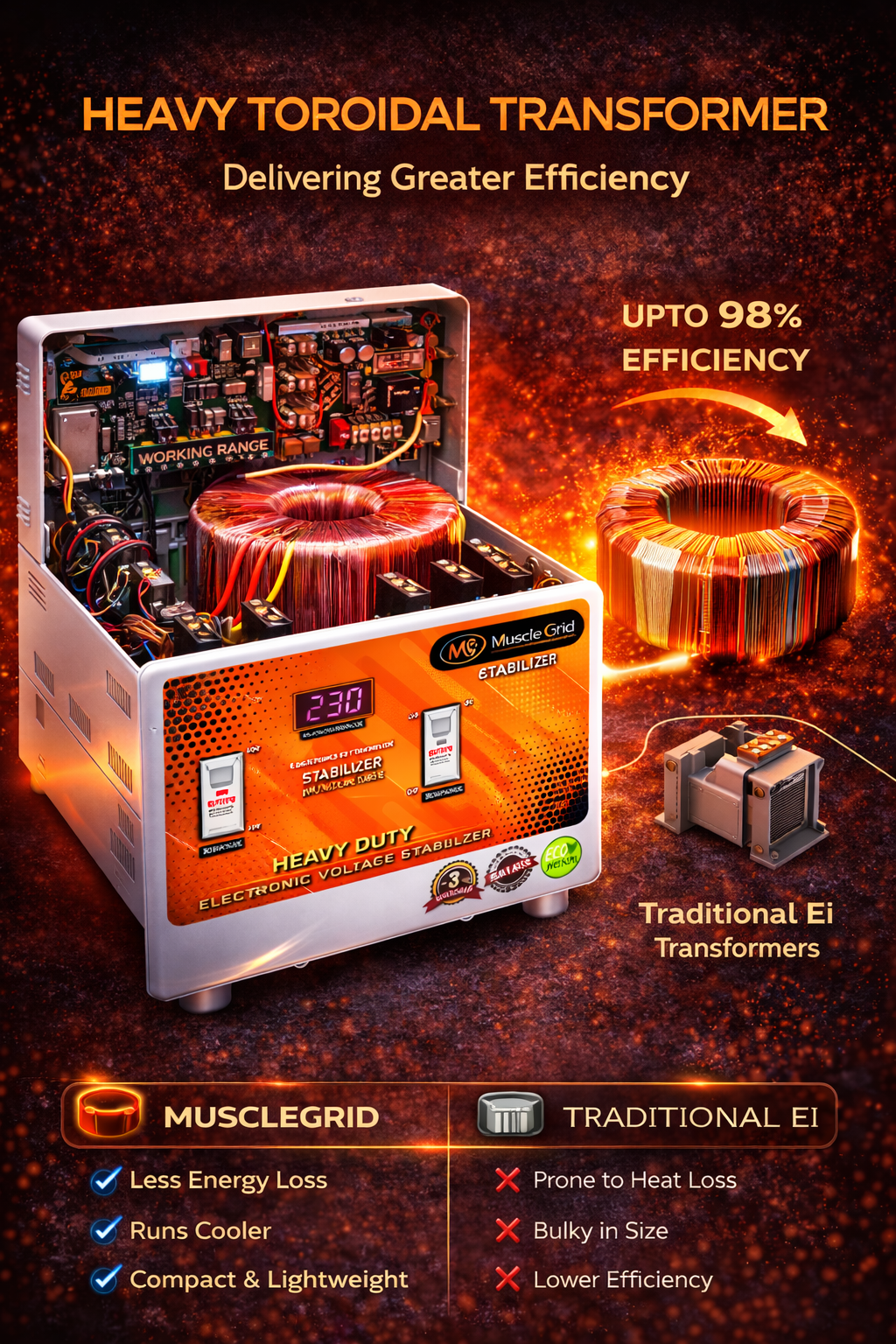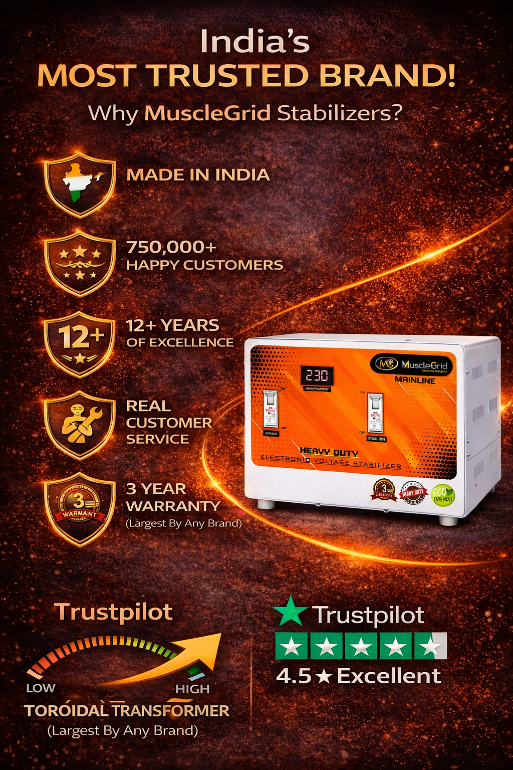 The MuscleGrid 5kVA Heavy Duty Voltage Stabilizer with a 50V–300V input range is suitable for homes facing extreme voltage fluctuations. It ensures stable voltage supply, protecting sensitive household appliances from electrical damage.